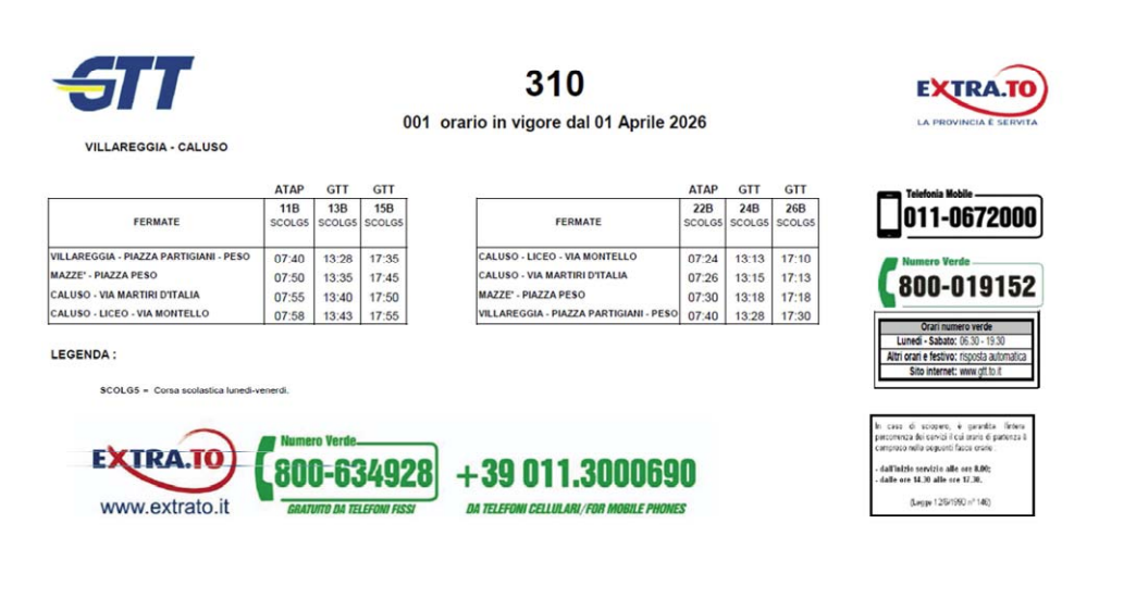 Si allegano i nuovi orari in vigore per la linea Villareggia – Mazzè – Caluso